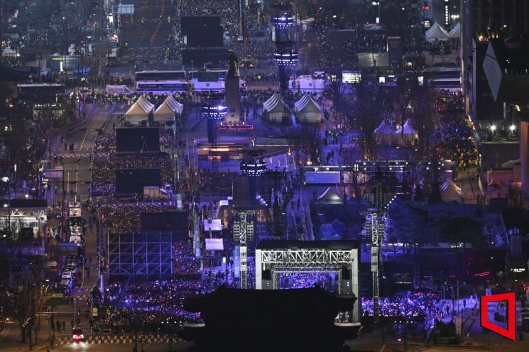 북악산에서 내려다본 BTS 완전체 컴백 공연 'BTS 컴백 라이브: ARIRANG'이 열리는 광화문 광장에 팬들의 보랏빛 응원봉 불빛으로 가득하다. 사진공동취재단