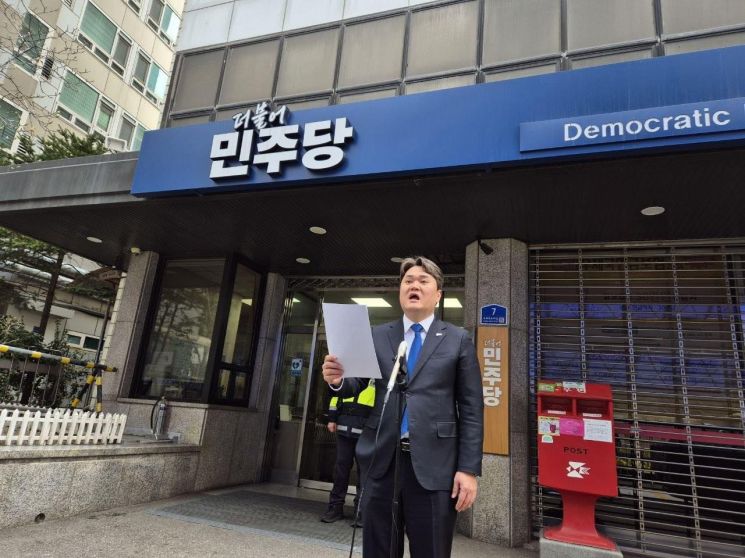 더불어민주당 김지호 경기 성남시장 예비후보가 22일 서울 여의도 당사 앞에서 단수공천된 김병욱 후보 장남의 아파트 구입자금 등에 대한 검증 및 공정한 경선 기회 제공 등을 당에 촉구하는 기자회견을 하고 있다. 김지호 후보 페이스북