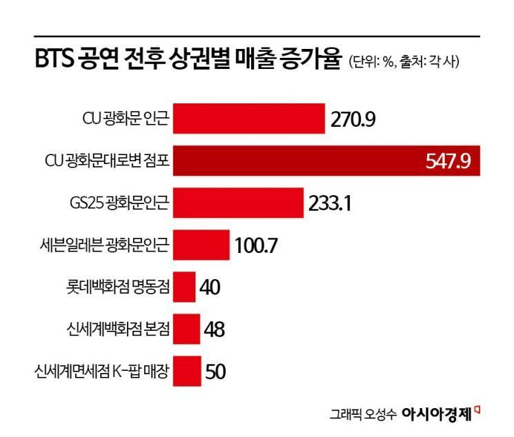23일 유통업계에 따르면 BGF리테일 BGF리테일 close 증권정보 282330 KOSPI 현재가 133,900 전일대비 900 등락률 -0.67% 거래량 33,184 전일가 134,800 2026.04.03 15:30 기준 관련기사 [특징주]BGF리테일, CU 이동형 편의점 이익 기대감에 6%↑ “찾아가는 편의점 통했다”…CU, 출동 횟수 4배 증가 가성비 한끼 대명사였는데 6000원도 '훌쩍'…마트·편의점 '반값' 공략 이 운영하는 편의점 CU는 광화문 인근 10개 점포의 매출이 270.9% 상승했다. 공연장과 가장 인접한 대로변 점포 3곳의 매출은 547.9% 급증했다. 특히 CU 광화문 편의점에서 매출이 높았던 제품 1~4위가 모두 BTS 앨범이었다. CU는 공연 당일인 지난 21일부터 BTS 신규앨범인 '아리랑' 관련 상품을 선보였다.