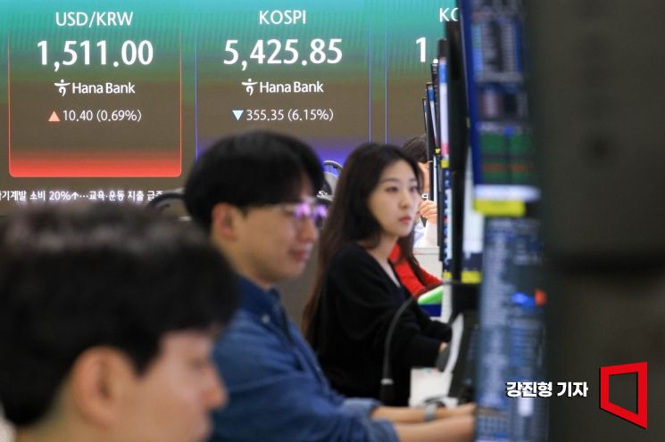 중동 전쟁 확전 공포에 코스피 지수가 전 거래일 대비 201.05포인트 내린 5580.15에 장을 시작한 23일 서울 중구 하나은행 딜링룸 전광판에 국내증시 및 환율 현황이 표시돼 있다. 이날 원달러 환율은 전 거래일 대비 4.3원 오른 1504.9원으로 거래를 시작 했다.
