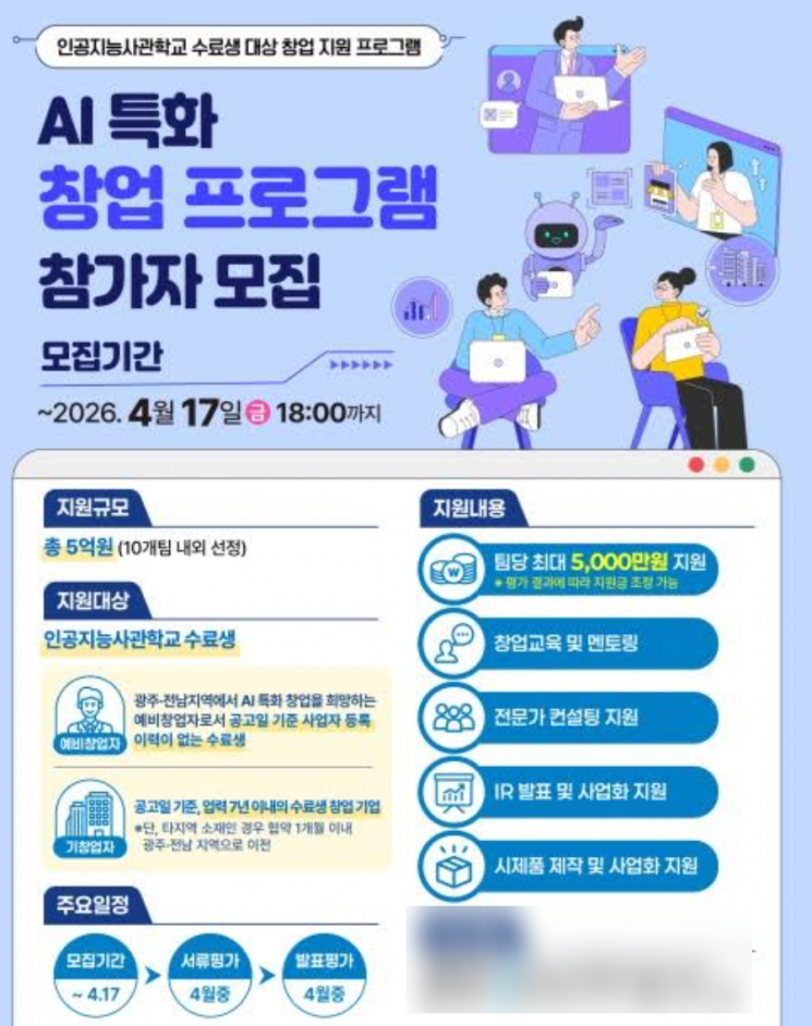 인공지능산업융합사업단은 과학기술정보통신부, 광주광역시, 정보통신산업진흥원 지원으로 '2026년 AI 특화 창업 프로그램'을 추진하고, 다음 달 17일까지 참가자를 모집한다고 23일 밝혔다.