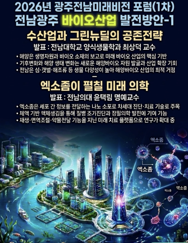 광주·전남 민간 싱크탱크 광주전남미래비전이 해양바이오 산업과 엑소좀 기반 차세대 의료기술을 주제로 지역 미래 성장 전략을 논의하는 정책 포럼을 연다.