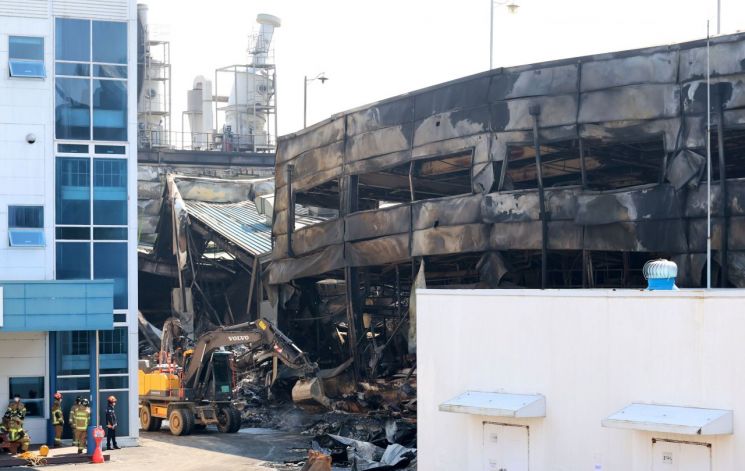 21일 오후 대형 화재가 발생했던 대전 대덕구 안전공업의 건물이 골격만 남아 있다. 소방당국이 잔해 정리를 위해 중장비를 동원하고 있다. 최영찬 기자 연합뉴스