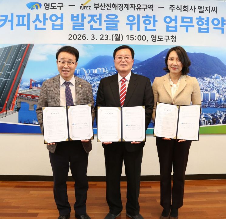 부산진해경제자유구역청(청장 박성호)이 23일 부산 영도구청에서 영도구(구청장 김기재), ㈜LGC(대표 임수정)와 커피산업 발전을 위한 업무협약을 맺었다.
