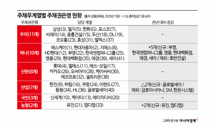 24일 금융당국에 따르면 금감원은 주채무계열 제도 개편을 위해 은행연합회와 주요 채권은행 등이 참여하는 태스크포스(TF)를 구성하고 개선 방안을 논의 중이다. 주채무계열 제도는 은행업감독규정에 따라 부채 규모가 큰 기업집단을 매년 선정해 주채권은행이 통합 관리하는 장치다. 은행 대출뿐 아니라 기업어음(CP), 매입외환, 사모사채 등 차입금 전반을 기준으로 대상 기업집단을 지정한다. 지난해 기준 SK, 현대자동차, 삼성 등 국내 주요 대기업 대부분이 포함돼 있다.