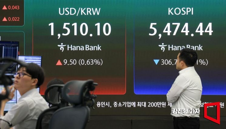 중동 전쟁 확전 공포에 코스피 지수가 전 거래일 대비 201.05포인트 내린 5580.15에 장을 시작한 23일 서울 중구 하나은행 딜링룸 전광판에 국내증시 및 환율 현황이 표시돼 있다. 이날 원달러 환율은 전 거래일 대비 4.3원 오른 1504.9원으로 거래를 시작 했다. 2026.3.23 강진형 기자