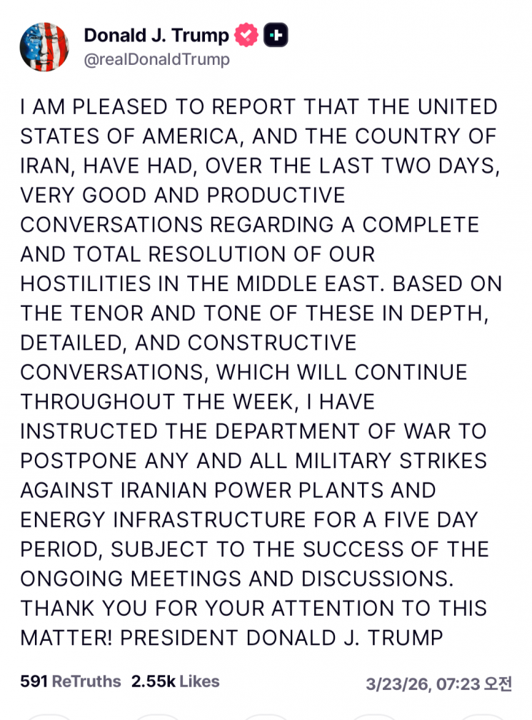 도널드 트럼프 미국 대통령이 이란과 '생산적인 대화'를 나누었다며 이란 에너지 인프라에 대한 공격을 5일간 유예한 것과 관련해 이란은 공식입장을 내놓지 않고 있다.