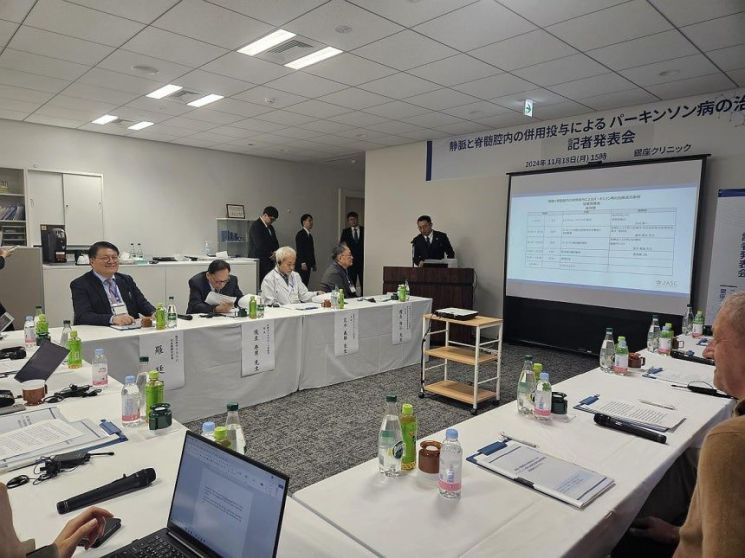 네이처셀 관계사 바이오스타 줄기세포기술연구원이 2024년 일본 도쿄 긴자클리닉에서 기자간담회를 열고 자가지방 줄기세포 정맥·척수강내 병행 투여 치료 성과를 발표하고 있다. 라정찬 원장(왼쪽 첫 번째)과 아라키 요시오 일본 의사(세 번째)가 참석했다. 연합뉴스