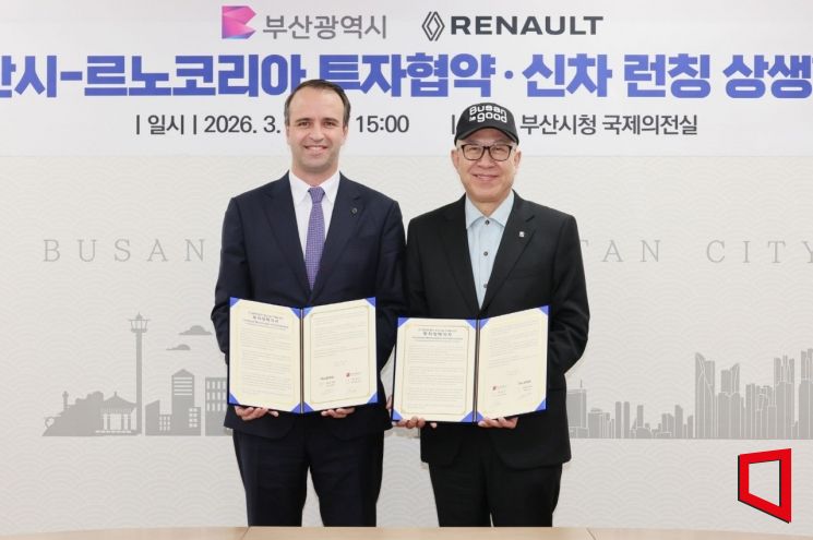 르노코리아는 23일 부산시청에서 부산시와 부산공장 전기차 생산시설 구축에 대한 협약을 체결했다고 24일 밝혔다. 지난해 '아시아태평양경제협력체(APEC) CEO 써밋 코리아 2025'에서 발표한 신규 투자 계획의 일환으로 진행된 협약이다.