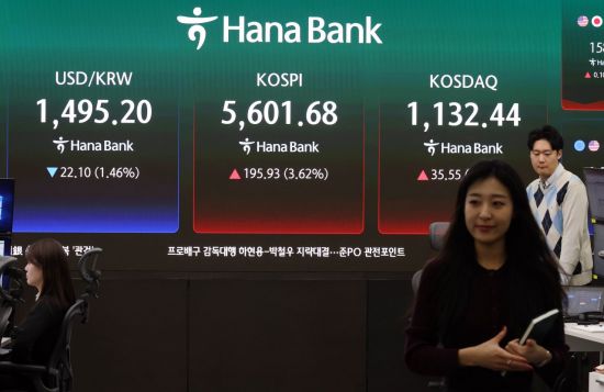 미국과 이란의 전쟁 협상 기대감에 뉴욕증시가 반등 마감한 가운데 국내 증시도 상승 출발한 24일 서울 하나은행 본점 딜링룸에서 직원들이 업무를 보고 있다. 이날 코스피 지수는 전 거래일 대비 232.45포인트(4.30%) 오른 5,638.20에, 코스닥은 37.27포인트(3.40%) 오른 1,134.16, 원·달러 환율은 26.4원 내린 1490.9원에 거래를 시작했다. 2026.3.24 조용준 기자