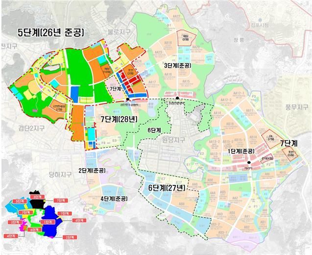 택지 개발은 모두 7개 단계로 나뉘어 추진되며 지난해까지 1∼4단계 택지가 준공됐다. 나머지 6단계(1.409㎢), 7단계(1.148㎢) 사업은 각각 내년 말과 2028년 말에 순차적으로 준공된다.