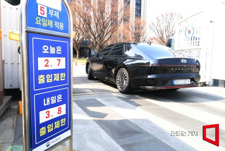 원유 자원안보위기 주의 경보 발령에 따라 25일 0시를 기해 전기차와 수소차를 제외한 공공부문 '승용차 5부제(요일제)'가 의무화된다. 사진은 24일 서울 종로구 정부서울청사 입구에 차량 5부제 실시 안내문이 설치돼 있다.