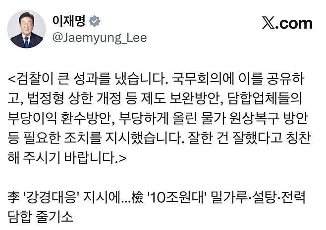 이 대통령이 검찰의 담합 수사를 공개 칭찬한 것은 이번이 처음이 아니다. 이 대통령은 지난 2월 2일 엑스(X)에 "검찰이 큰 성과를 냈다"면서 "잘한 건 잘했다고 칭찬해주기 바란다"는 글을 올렸다. 이 대통령은 '李 강경대응 지시에…檢 10조원대 밀가루·설탕·전력 담합 줄기소'라는 제목의 언론 기사 링크를 공유하며 이같이 썼다. 하루 뒤인 2월 3일 국무회의에서도 이 대통령은 구자현 검찰총장 직무대행에게 "검찰이 민생 사범 단속을 잘 해가지고 상당한 성과를 냈는데 정말 잘하셨다"고 했다.