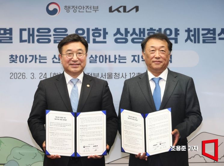 윤호중 행정안전부 장관(왼쪽)과 최준영 KIA대표이사가 24일 서울 종로구 정부서울청사에서 지방소멸 대응을 위한 상생협약 체결식을 갖고 기념촬영을 하고 있다.