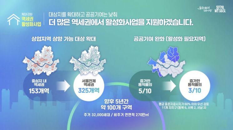 사업성이 낮은 외곽 지역에 대해서는 역세권 활성화 사업을 촉진하기 위해 용적률 상향에 따른 공공기여 비율도 50%에서 30%로 낮춰주기로 했다. 대상 지역은 서울 평균 공시지가의 60%에 못 미치는 11개 자치구다.