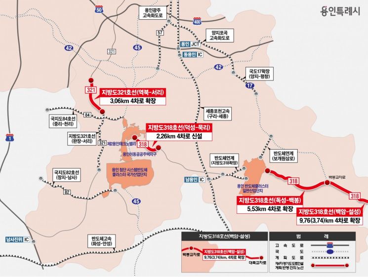 지방도 318호선 독성~백봉, 용인 백암~이천 설성 구간 확장 사업은 각각 반도체클러스터 일반산업단지 동측에서 백암면 백봉교차로까지 5.53㎞, 백암면 백봉교차로에서 이천 설성면 대죽교차로까지 9.76㎞ 등 총 15.3㎞ 구간을 4차로로 확장하는 공사다.