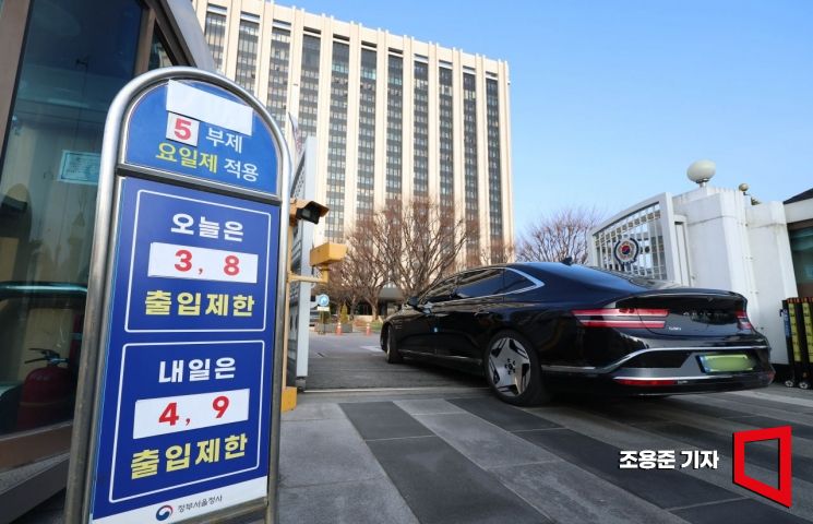 중동사태에 따른 에너지 절약을 위해 공공부문 '승용차 5부제(요일제)'가 본격 시행된 25일 서울 종로구 정부서울청사 출입문에 승용차 요일제 안내문이 붙어 있다.