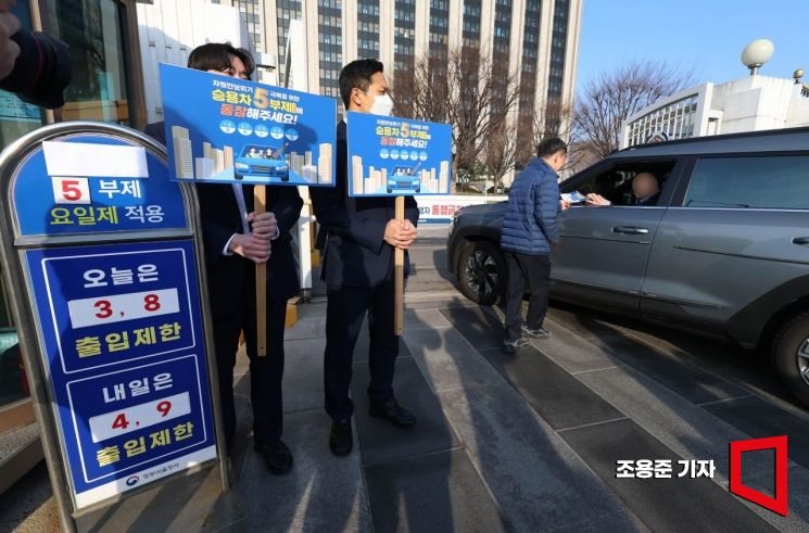 중동사태에 따른 에너지 절약을 위해 공공부문 '승용차 5부제(요일제)'가 본격 시행된 25일 서울 종로구 정부서울청사 출입문에서 청사관리소 관계자들이 승용차 5부제 캠페인을 하고 있다.