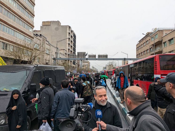 지난 13일(현지시간) 이란의 수도 테헤란에서 열린 '쿠드스의 날(Quds Day)' 집회에 참석한 아바스 아라그치(Abbas Araghchi) 이란 외무장관(가운데)이 취재진에 답하고 있다. 테헤란(이란)=UPI연합뉴스