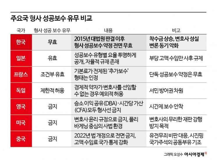 영미법의 본산인 영국은 승소 이익의 일정 비율을 변호사가 공유하는 '손해배상 연동 보수(DBA)'는 물론 승소 시 시간당 수임료를 가산하는 '조건부 보수 약정(CFA)'조차 형사사건에서는 금지하고 있다. 다만 영국은 형사사건에서 고정 수임료와 시간 기준 보수가 혼합된 국가 보수체계라는 점에서 성공보수 없이 변호사의 성실 변론이 담보되는 구조다.