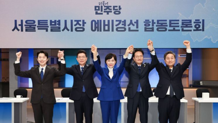 (서울=연합뉴스) 20일 서울 마포구 JTBC에서 열린 더불어민주당 서울시장 예비경선 합동토론회에서 예비후보들이 기념 촬영하고 있다. 왼쪽부터 김형남, 정원오, 전현희, 박주민, 김영배 예비후보. 2026.3.20 [국회사진기자단] photo@yna.co.kr(끝)