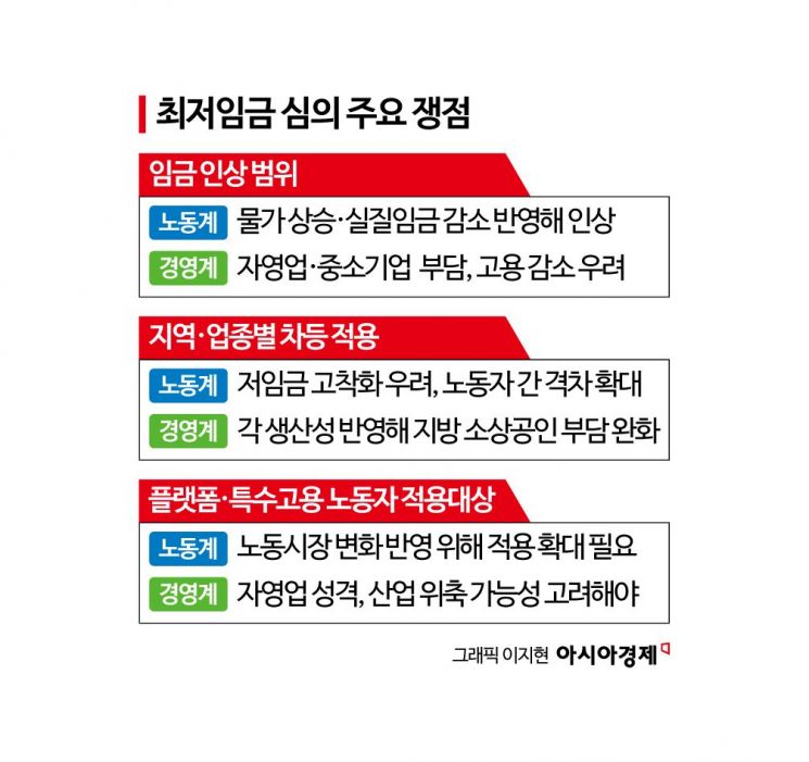 지역·업종별 차등적용 여부도 주요 쟁점이다. 경영계는 지역별 비용 구조와 업종별 생산성 차이를 반영해야 한다며 차등적용 도입을 꾸준히 요구하고 있다. 실제 지난해 중소기업중앙회가 공개한 '중소기업 최저임금 관련 애로 실태 및 의견조사'에 따르면 최저임금 제도 개선 과제로 '취약 업종에 대한 차등 적용'을 꼽은 응답이 33.2%로 가장 높게 나타났다. 또 중소기업의 66%는 내년도 최저임금을 동결하거나 인하해야 한다고 답했는데, 1만원이 넘는 최저임금이 부담된다는 의견이 전체 응답의 72%를 차지했다. 노동계는 차등적용이 도입될 경우 저임금 구조를 고착화하고 노동자 간 격차를 확대할 수 있다며 반발하고 있다. 제도의 형평성을 훼손할 수 있다는 점에서 노사 간 입장차가 큰 사안이다.