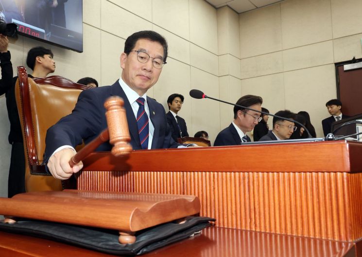 신정훈 국회 행정안전위원회 위원장이 26일 국회에서 열린 행안위 전체회의에서 5월1일 노동절을 법정 공휴일로 지정하는 공휴일에 관한 법률 일부개정안을 의결하고 있다. 연합뉴스