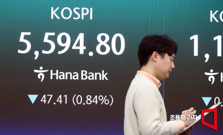 미국이 제시한 협상안에 이란이 거부 의사를 밝히면서 다시 긴장감이 감도는 가운데 국내 증시는 하락 출발한 26일 서울 중구 하나은행 본점 딜링룸에서 직원이 증시와 환율 등을 모니터하고 있다. 이날 코스피는 전 거래일 대비 48.15p(0.85%) 내린 5594.06으로 장을 시작했다. 2026.3.26 조용준 기자
