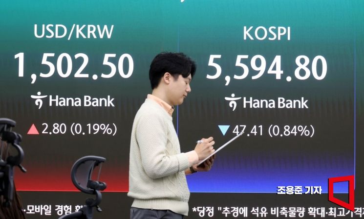 미국이 제시한 협상안에 이란이 거부 의사를 밝히면서 다시 긴장감이 감도는 가운데 국내 증시는 하락 출발한 26일 서울 중구 하나은행 본점 딜링룸에서 직원이 증시와 환율 등을 모니터하고 있다. 이날 코스피는 전 거래일 대비 48.15p(0.85%) 내린 5594.06으로 장을 시작했다. 2026.3.26 조용준 기자