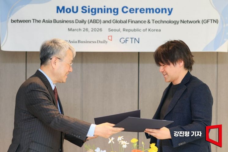 장범식 아시아경제 대표이사(왼쪽)와 타케시 키토 GFTN JAPAN 대표가 26일 서울 여의도 메리어트 이그제큐티브 아파트먼트 파크카페에서 열린 '아시아경제-싱가포르 GFTN(Global Finance & Technology Network), 글로벌 디지털 자산 포럼 공동 개최 위한 업무협약 체결'에 참석해 협약서를 교환 하고 있다.