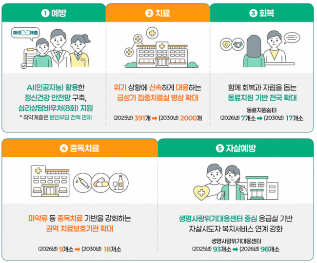 인공지능(AI)기반 심리케어 도입, 청년층 정신건강검진 확대 등에 예산과 인력을 집중 투입해 정신건강 예방부터 치료, 회복에 이르는 전 과정에서 국가 책임을 강화하기로 했다.