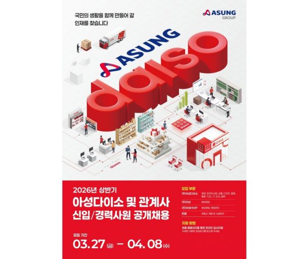 아성다이소 및 관계사에서 다음 달 8일까지 공식 채용 홈페이지에서 신입 및 경력 대규모 공개 채용을 시작한다고 27일 밝혔다.