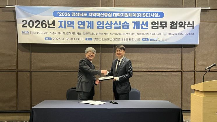 경남도의사회와 경상국립대 의대, 창원·마산·진해·김해·진주 지역 의사회는 지난 26일 창원 그랜드 머큐어 앰배서더 호텔에서 '지역의료 인재 양성 및 지역의료 발전을 위한 임상 실습 개선 업무협약'을 맺었다.