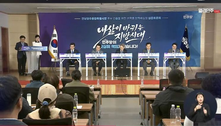 28일 순천대학교에서 진행된 전남 동부권 배심원 권역별 토론회에서 김영록, 강기정, 민형배, 신정훈, 주철현 등 5명의 민주당 소속 후보들이 지역 현안과 정책을 놓고 서로 날선 견제와 신경전을 펼쳤다. 델리민주 유튜브 캡쳐.
