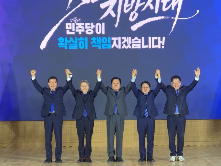 왼쪽부터 신정훈·민형배·주철현·강기정·김영록 더불어민주당 전남·광주 통합특별시장 경선 후보들이 29일 오후 광주 동구 조선대학교 서석홀에서 열린 권역별 정책배심원 심층토론회 광주권역 일정에 앞서 기념촬영을 하고 있다. 송보현 기자
