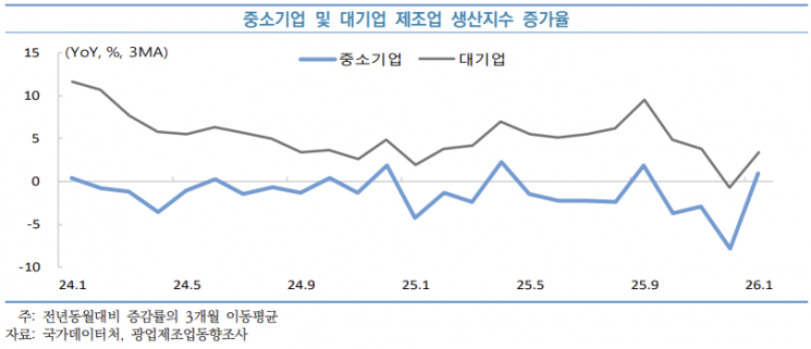 중소벤처기업연구원은 "2026년에 들어서며 중소기업 경기는 생산 회복세와 더불어 창업 및 고용지표가 개선되는 것으로 보이나, 대출연체율 상승 등 자금사정은 여전히 불안정하다"며 "중동전쟁 발발로 대외 여건의 불확실성이 확대됨에 따라 생산, 수출 등 중소기업에 미칠 부정적 영향이 최소화될 수 있도록 정책적 노력이 필요하다"고 설명했다.