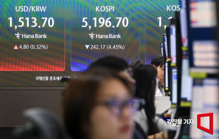 코스피 지수가 중동 전쟁 불확실성에 따른 국제유가 급등에 장초반 4%대 급락하며 5200선 하회한 30일 서울 중구 하나은행 딜링룸 전광판에 국내증시 현황이 표시돼 있다. 이날 원달러 환율은 전 거래일 대비 4.5원 오른 1513.4원에 거래를 시작 했다.