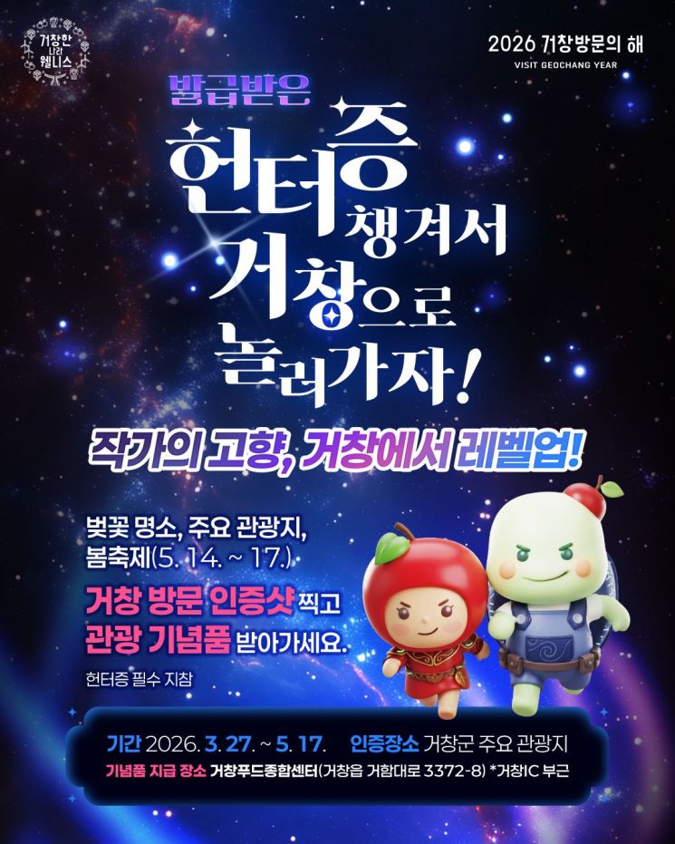 이번 이벤트는 창원 컨벤션센터(CECO) 팝업 전시회에서 화제를 모으고 있는 '헌터증' 소지자들을 대상으로, 작가의 성장 배경이자 창작의 영감이 깃든 거창군의 주요 관광지와 봄꽃 명소, 축제 현장을 방문하고 인증 완료 시 거창 푸드 종합센터에서 기념품을 받을 수 있다.