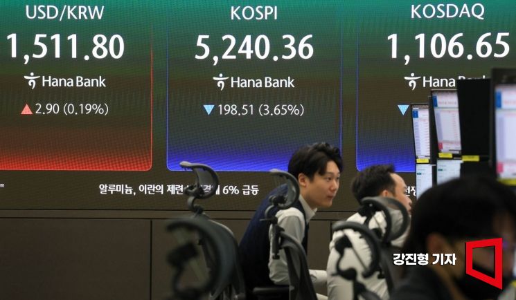 코스피 지수가 중동 전쟁 불확실성에 따른 국제유가 급등에 장초반 4%대 급락하며 5200선 하회한 30일 서울 중구 하나은행 딜링룸 전광판에 국내증시 현황이 표시돼 있다. 이날 원달러 환율은 전 거래일 대비 4.5원 오른 1513.4원에 거래를 시작 했다. 2026.3.30 강진형 기자