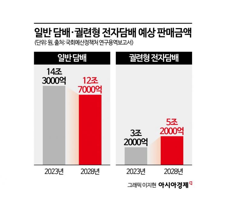 1일 국회예산정책처가 한국담배규제연구교육센터에 의뢰한 연구용역보고서에 따르면 일반 담배의 총 판매금액은 2023년 약 14조3000억원에서 2028년 약 12조7000억원으로 감소할 것으로 예상된다. 반면 궐련형 전자담배는 같은 기간 약 3조2000억원에서 5조2000억원으로 확대될 것으로 전망됐다. 이 기간 우리나라 담배 시장은 판매금액 기준 17조8000억원에서 18조1000억원으로 커질 것으로 관측됐다.