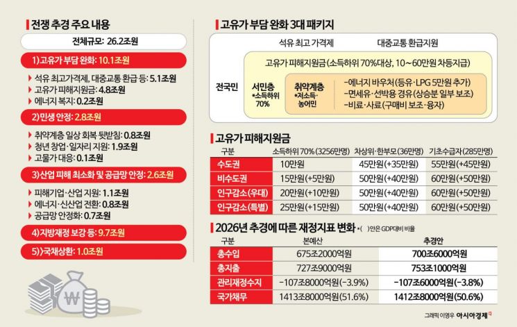 이번 추경에는 석유 최고가격제 시행에 따른 손실보전과 나프타 수급 지원, 에너지 전환 및 K-패스 환급 확대 등 고유가 직격탄을 맞은 민생 경제를 보호하는 데 방점이 찍혔다. 관련 예산 규모를 합하면 약 6조2000억원에 달한다.