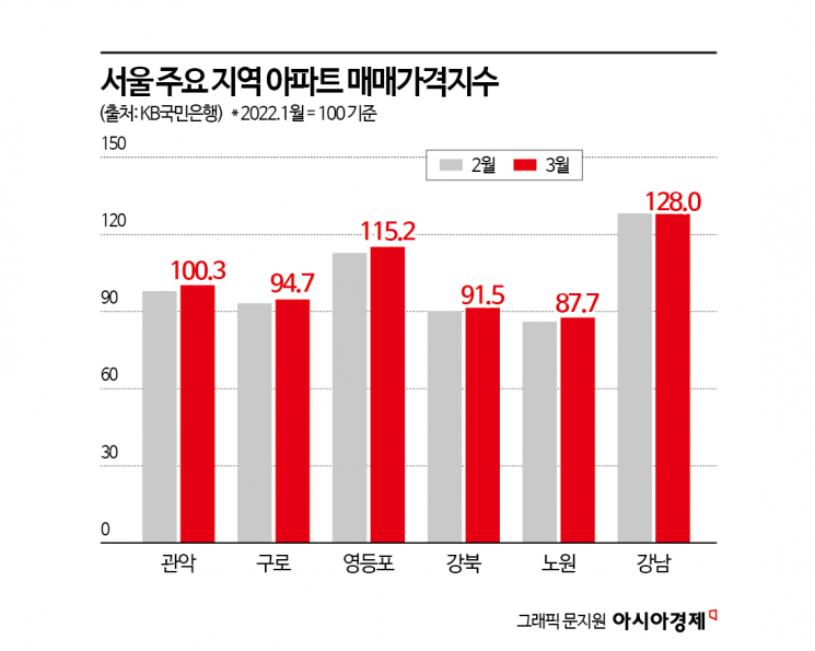 강북권에서는 14개 구 모두 전월보다 지수가 올랐다. 한국부동산원 통계에서 이달 들어 가격이 하락세로 전환한 용산구 역시 KB국민은행 통계에서는 2월 122.7에서 124.6으로 1.5% 상승한 것으로 나타나 정부-민간 통계 간 괴리를 보였다.