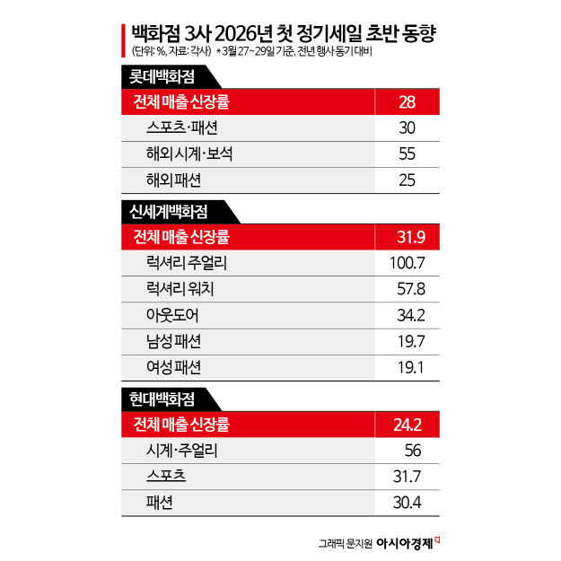 백화점 3사가 진행 중인 올해 첫 정기세일이 초반 순항하는 것으로 나타났다. 웨딩 성수기와 본격적인 나들이 시즌을 맞아 시계와 보석, 패션군을 중심으로 매출을 끌어올렸다. 내수 침체 속에 미국과 이스라엘의 이란 공습으로 시작된 중동발(發) 전쟁 여파까지 겹쳐 물가와 환율이 오르는 상황이지만, 소비 심리가 얼어붙지 않았다는 점에서 관련 업계가 안도하는 분위기다.
