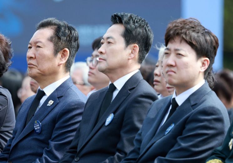 장동혁 국민의힘 장동혁 대표(가운데)와 이준석 개혁신당 대표(오른쪽)가지난 27일 국립대전현충원에서 이재명 대통령의 서해수호의 날 기념사를 듣고 있다. 연합뉴스 제공