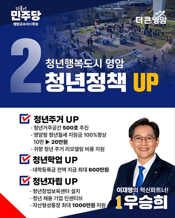 우승희 예비후보는 30일 '인구 10만, 예산 1조 영암시대' 두 번째 공약으로 '청년행복도시' 조성을 발표하고 20·30·40 청년 세대의 삶 전반을 지원하는 정책을 추진하겠다고 밝혔다.