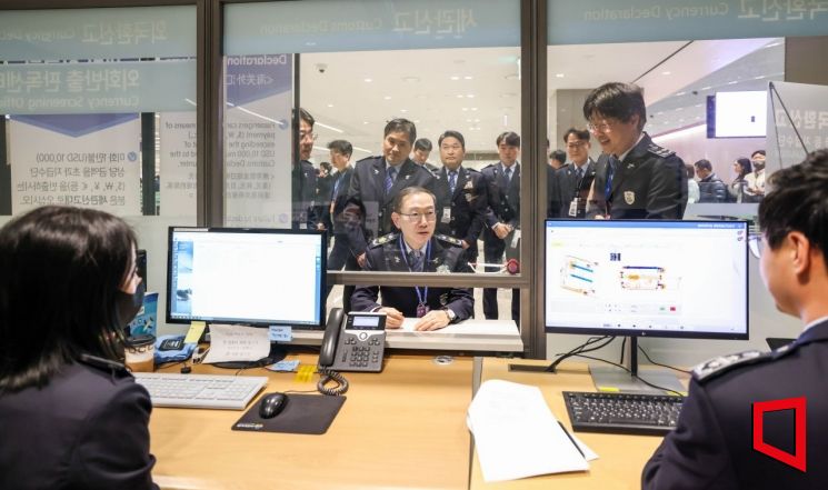 이명구 관세청장이 30일 인천국제공항 제2여객터미널에서 대국민 외화신고 캠페인을 마친 뒤 출국 여행자 휴대품 엑스레이 판독 업무를 점검하고 있다. 관세청 제공
