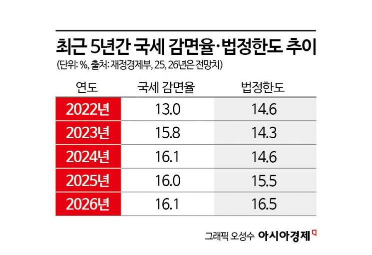 다만 재정 건전성의 척도인 국세감면율 법정한도는 지킬 수 있을 것으로 보인다. 올해 법정한도는 16.5%로, 정부의 국세감면율 전망치(16.1%)보다 0.4%포인트 높다. 예측치대로라면 2023년부터 3년 연속 이어졌던 '법정한도 위반' 꼬리표를 4년 만에 떼게 된다. 법정한도는 직전 3개년도 국세 감면율 평균에 0.5%포인트를 더한 값이다.