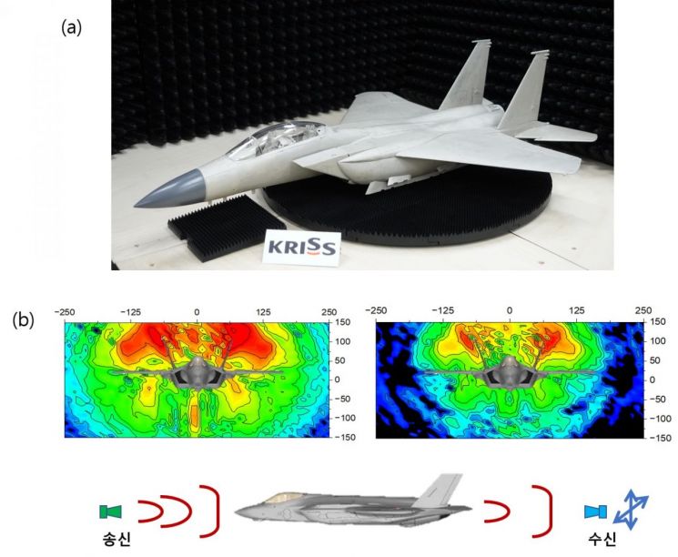KRISS 로봇 기반 전자파 측정시스템 활용 항공기 축소모형 산란특성 측정 사례. (a) 회전판 위 항공기 축소모형 측정 플랫폼. (b) 전자파 송·수신 기반 산란특성 측정 개념도와 결과. 컬러 분포도는 형상에 따른 전자파 산란 강도 변화를 나타낸다. 빨간색·노란색은 산란이 큰 영역, 초록색·파란색은 작은 영역으로, 산란이 작을수록 레이다 탐지 가능성이 낮다. 연구팀 제공
