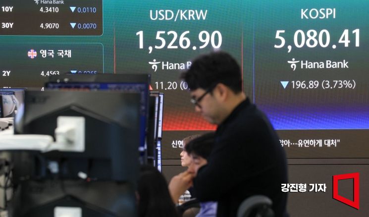 코스피 지수가 장초반 4% 넘게 하락하며 5100선이 붕괴된 31일 서울 중구 하나은행 본점 딜링룸 전광판에 국내증시 현황이 표시돼 있다. 이날 원달러 환율은 장중 1520원을 넘어서는 등 상승 압력이 이어지고 있다.
