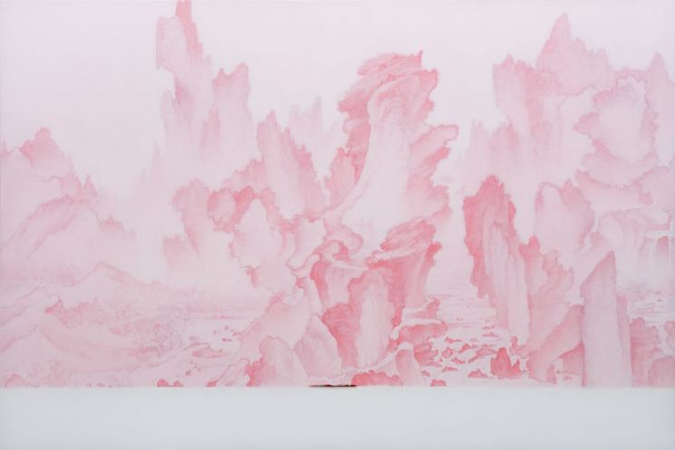 옅은 분홍과 마른 하늘빛, 한 번 빛이 빠져나간 듯한 회색. 화면은 크지만 목소리는 높지 않다. 대신 오래 본 것들이 늦게 떠오른다. 안견의 산수 같다가, 브뢰헐의 군중 같다가, 어느 순간 미키마우스 얼굴 하나가 불쑥 걸린다. 서울 통의동 아트사이드 갤러리에서 열리고 있는 한만영 개인전 'Time Stitching: 시간의 무늬'는 과거의 이미지를 다시 거는 전시가 아니다. 오래된 그림을 오늘 옆에 다시 눕혀 놓는 전시다.